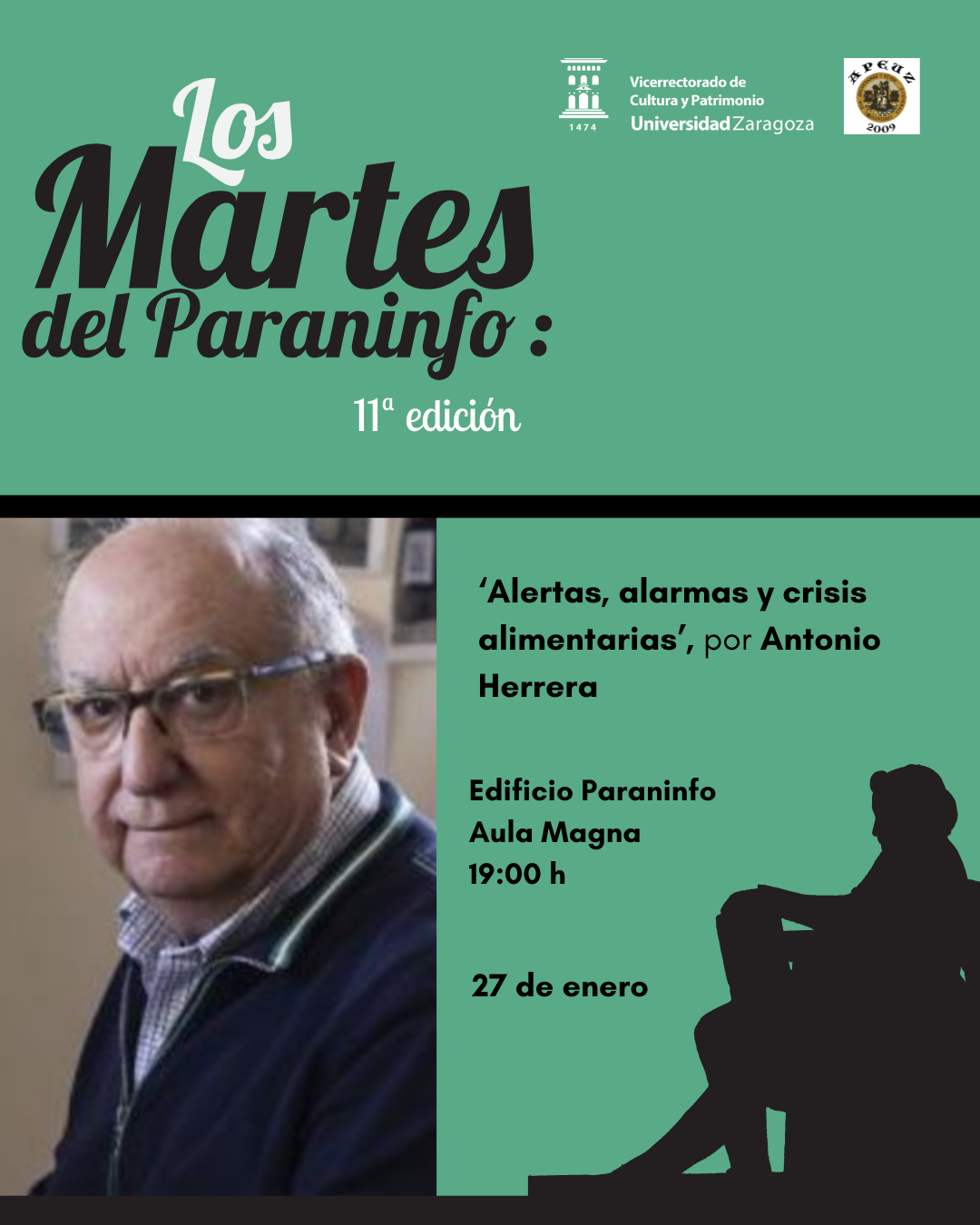 Este martes 27 de enero de 2026 ha tenido lugar una nueva sesión del ciclo 'Los martes del Paraninfo: Cita con los Profesores Eméritos' a cargo de Antonio Herrera. Su conferencia llevaba por título "Alertas, alarmas y crisis alimentarias". Este ciclo está organizado por el Vicerrectorado de Cultura y Patrimonio y la Asociación de Profesores Eméritos de la Universidad de Zaragoza (APEUZ).