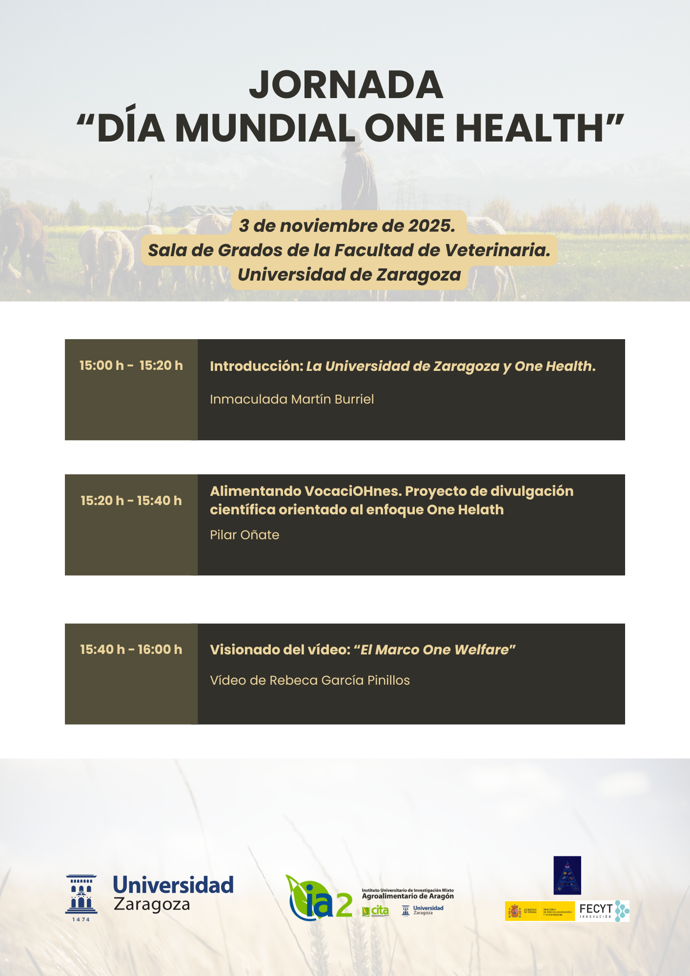 Durante el encuentro se presentará la visión de la Universidad de Zaragoza y del IA2 en relación al enfoque One Health, así como el proyecto “Alimentando VocaciOHnes”. También se podrá visualizar el vídeo “El Marco One Welfare”, de Rebeca García Pinillos, que complementa la perspectiva integrada de salud humana, animal y ambiental.