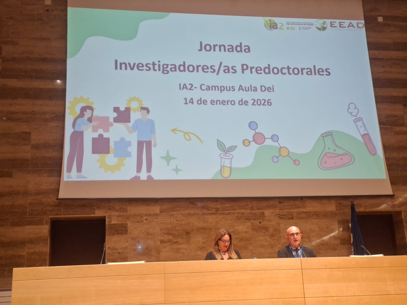 El Salón de Actos del Instituto Agronómico Mediterráneo de Zaragoza (CIHEAM) ha sido escenario este miércoles, 14 de enero de 2026, de la Jornada Investigadores Predoctorales IA2 - Campus Aula Dei. Un encuentro dirigido a investigadores-as predoctorales del Instituto Agroalimentario de Aragón (IA2) y del Campus Aula Dei con el objetivo de crear un espacio pensado para conocerse, interactuar y fortalecer la comunidad científica en formación. La jornada estaba igualmente abierta a la asistencia de público interesado en conocer el trabajo predoctoral que se está realizando actualmente en el ámbito agroalimentario en la Universidad de Zaragoza, CITA de Aragón y CSIC.