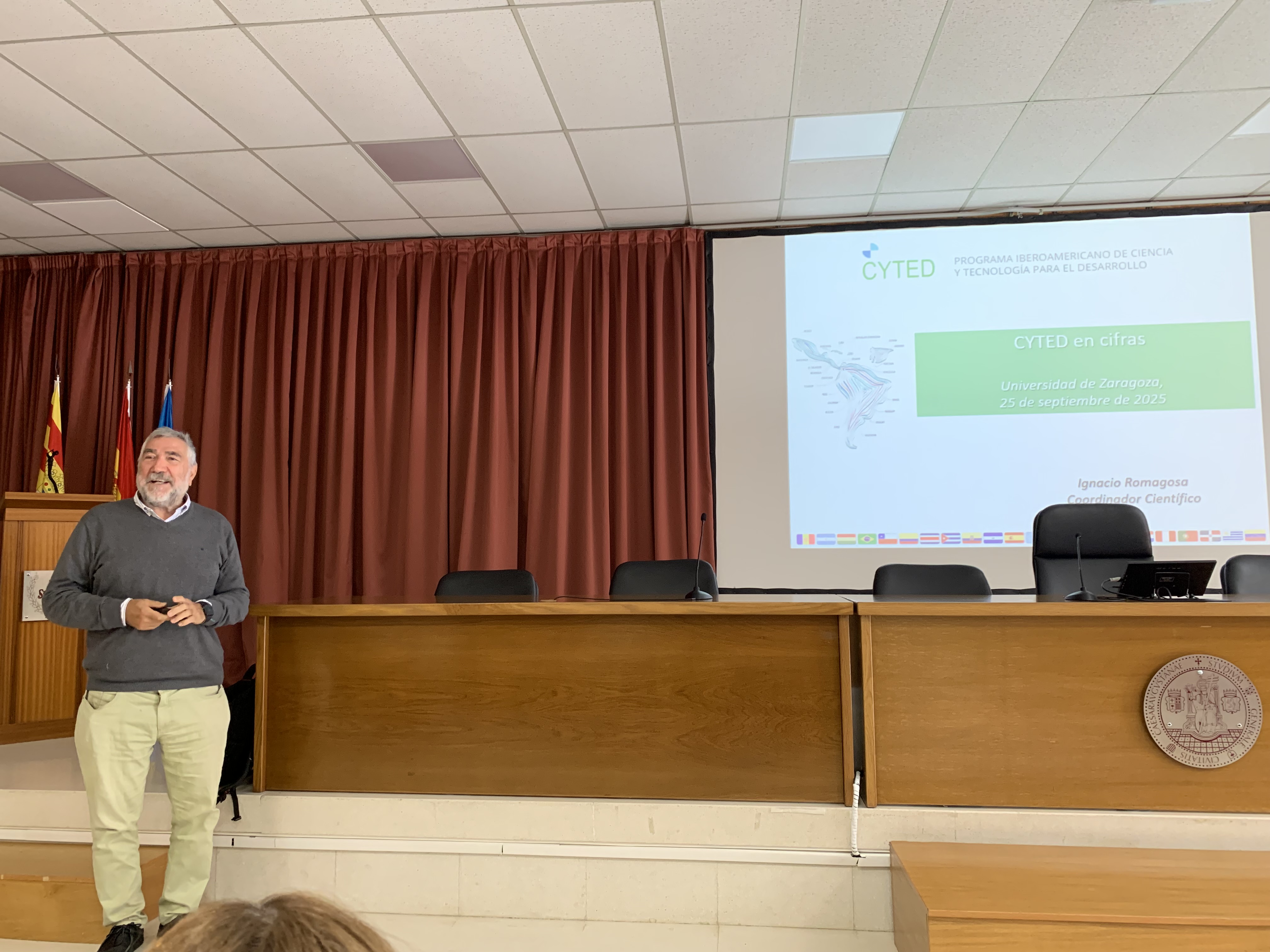 Este jueves, 25 de septiembre de 2025, el Salón de Actos de la Facultad de Veterinaria de la Universidad de Zaragoza ha acogida una nueva sesión de los seminarios organizados por el IA2. En esta ocasión su título ha sido "Programa CYTED (Programa Iberoamericano de Ciencia y Tecnología para el Desarrollo): oportunidades de colaboración en investigación con los países de Iberoamérica" y ha contado con la participación de El IA2 ha organizado este seminario en el que han intervenido Luis Telo da Gama, Secretario General de CYTED, e Ignacio Romagosa, coordinador científico del programa.